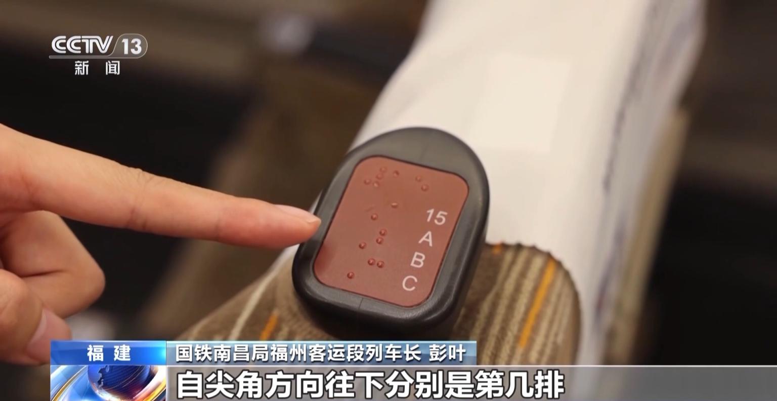 国铁南昌局福州客运段列车长彭叶:这些盲文符号,自尖角方向往下分别是第几排,以及自里而外的座位号。这样视障人士可以通过触摸获取座位信息,方便快速找到自己的座位。