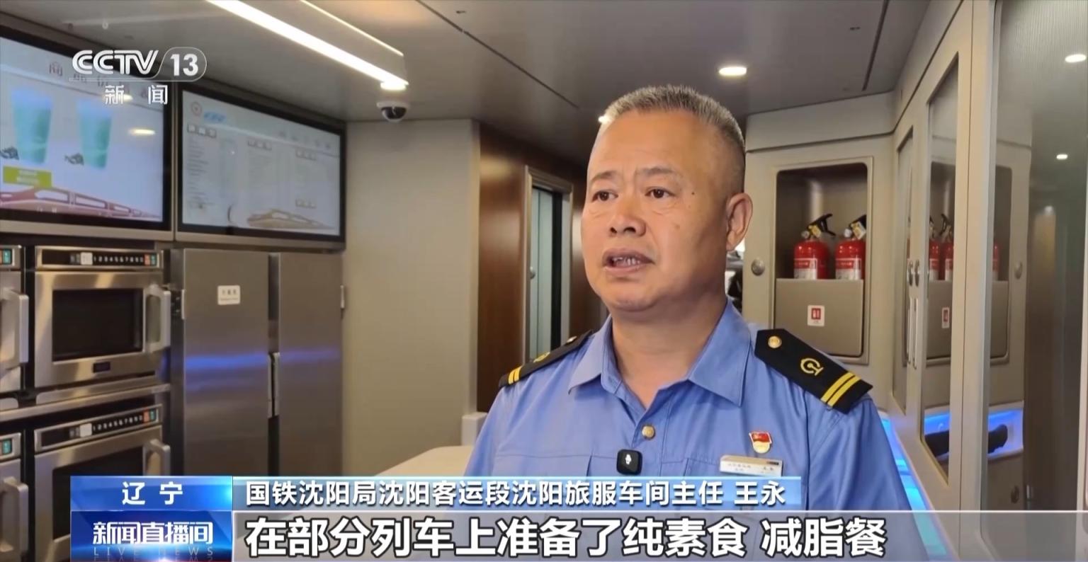 国铁沈阳局沈阳客运段沈阳旅服车间主任 王永:目前,高铁上的餐饮以冷链为主,根据列车经过的局域和旅客不同的饮食需求,在部分列车上准备了纯素食、减脂餐、民族特色餐饮等,提供多样用餐选择。也提醒大家,不同高铁线路、车次的餐食供应各有不同,旅客上车前可以通过12306查询了解,也可以在车上咨询列车工作人员。